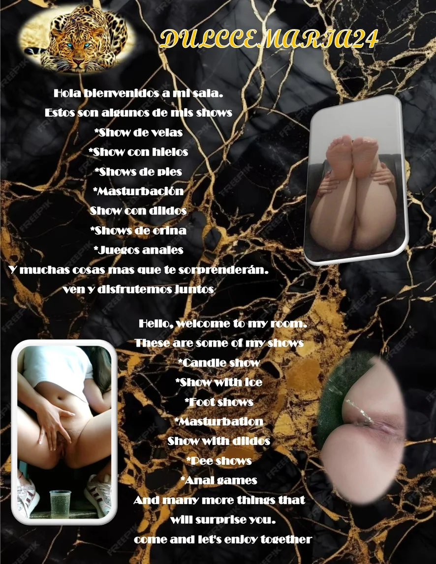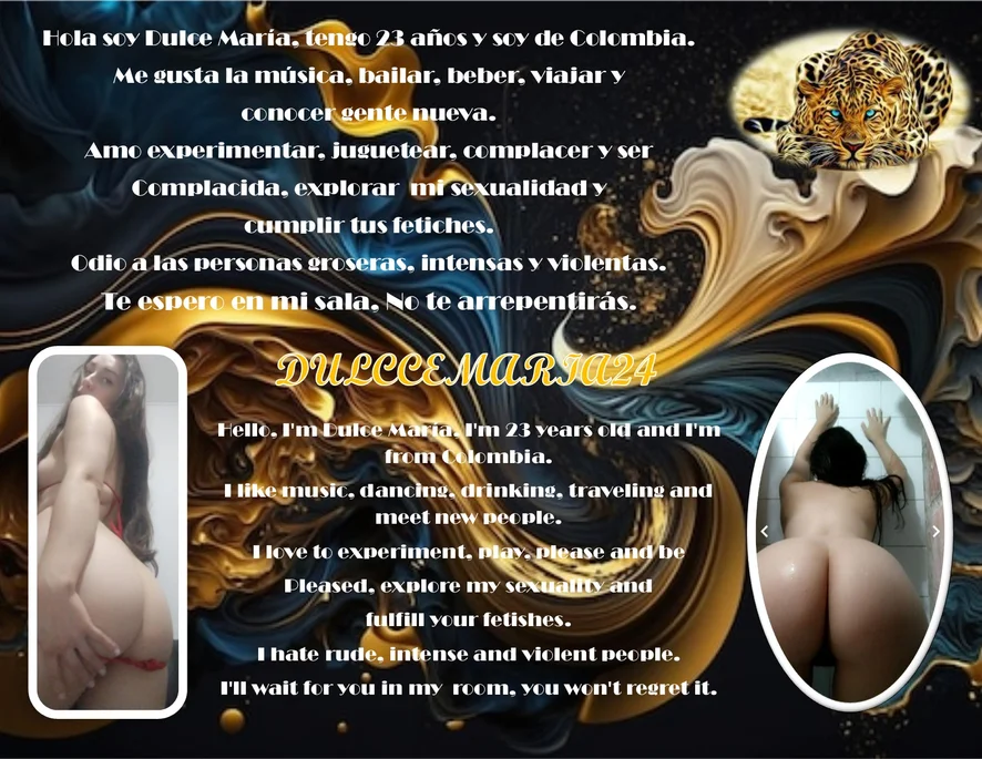 Hola soy Dulce María, tengo 23 años y soy de Colombia. Me gusta la música, bailar, beber, viajar y conocer gente nueva. Amo experimentar, juguetear, complacer y ser Complacida, explorar mi sexualidad y cumplir tus fetiches. Odio a las personas groseras, intensas y violentas. Te espero en mi sala, No te arrepentirás.